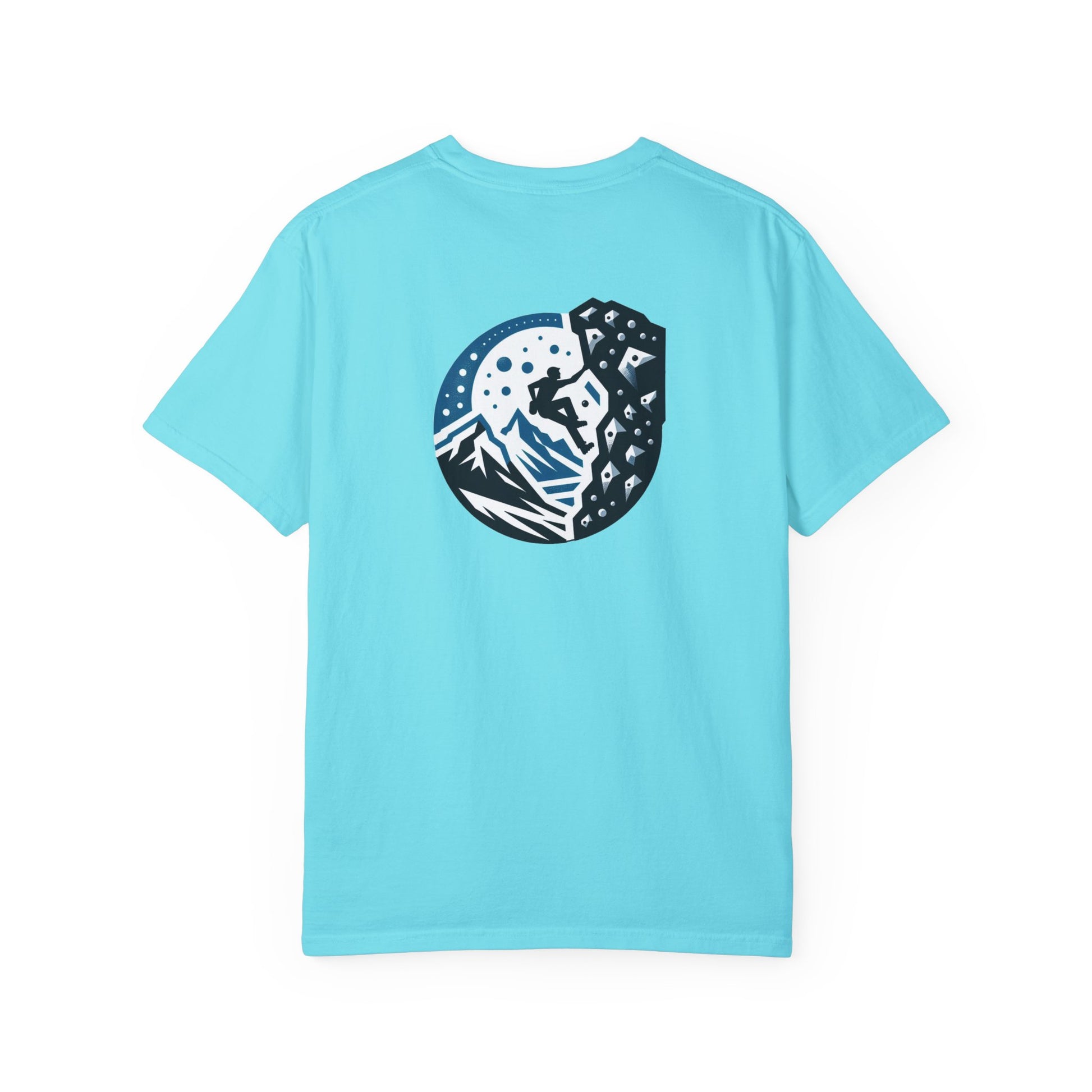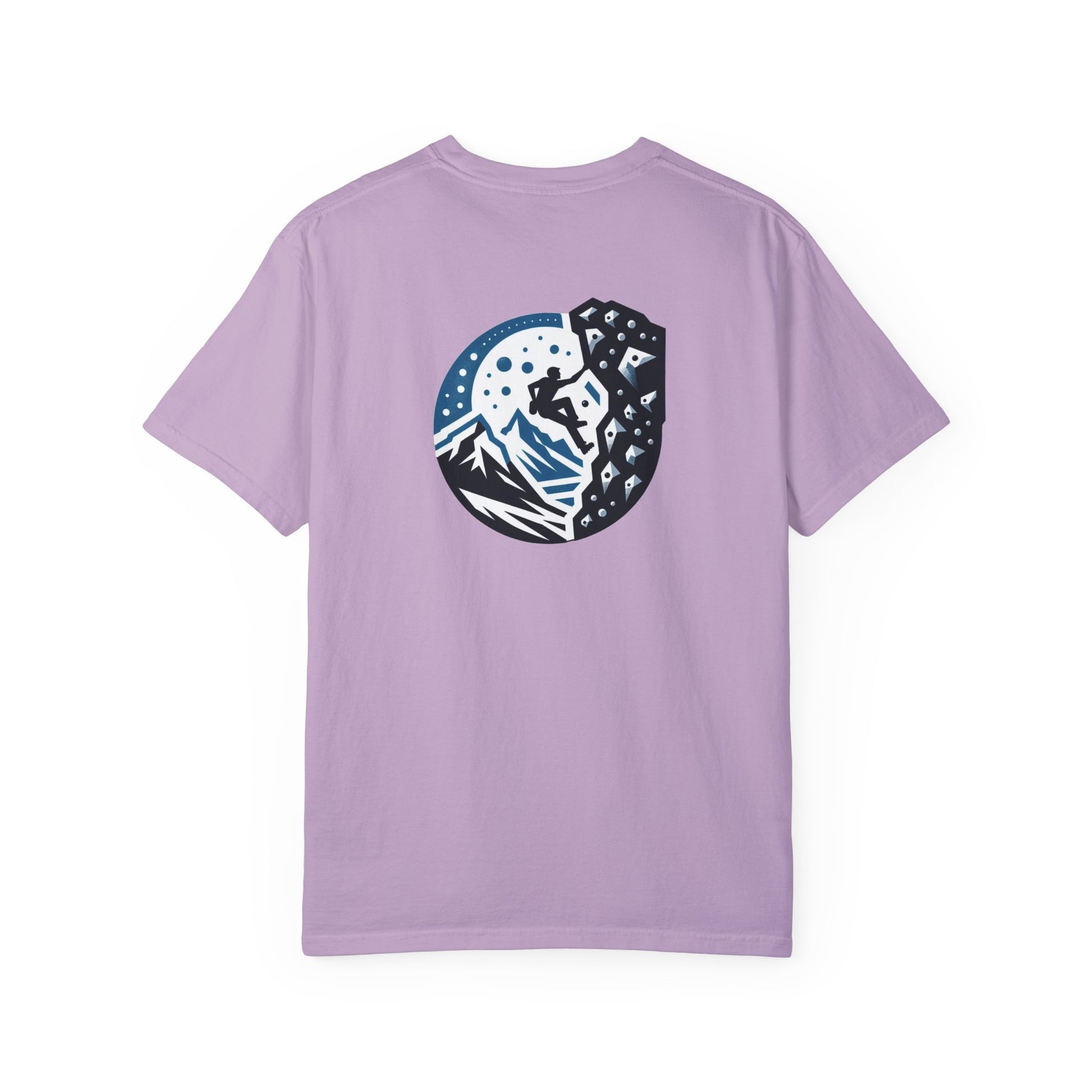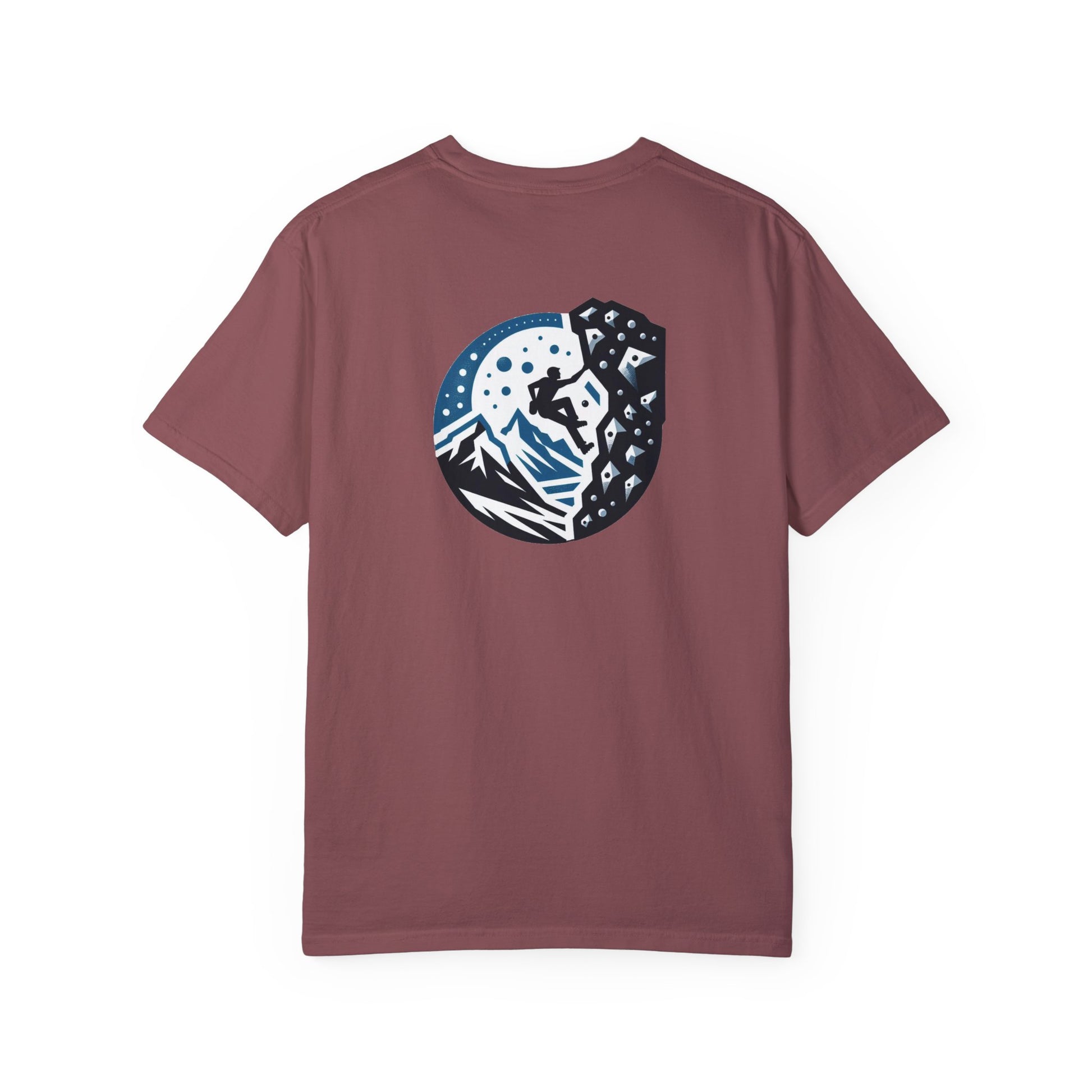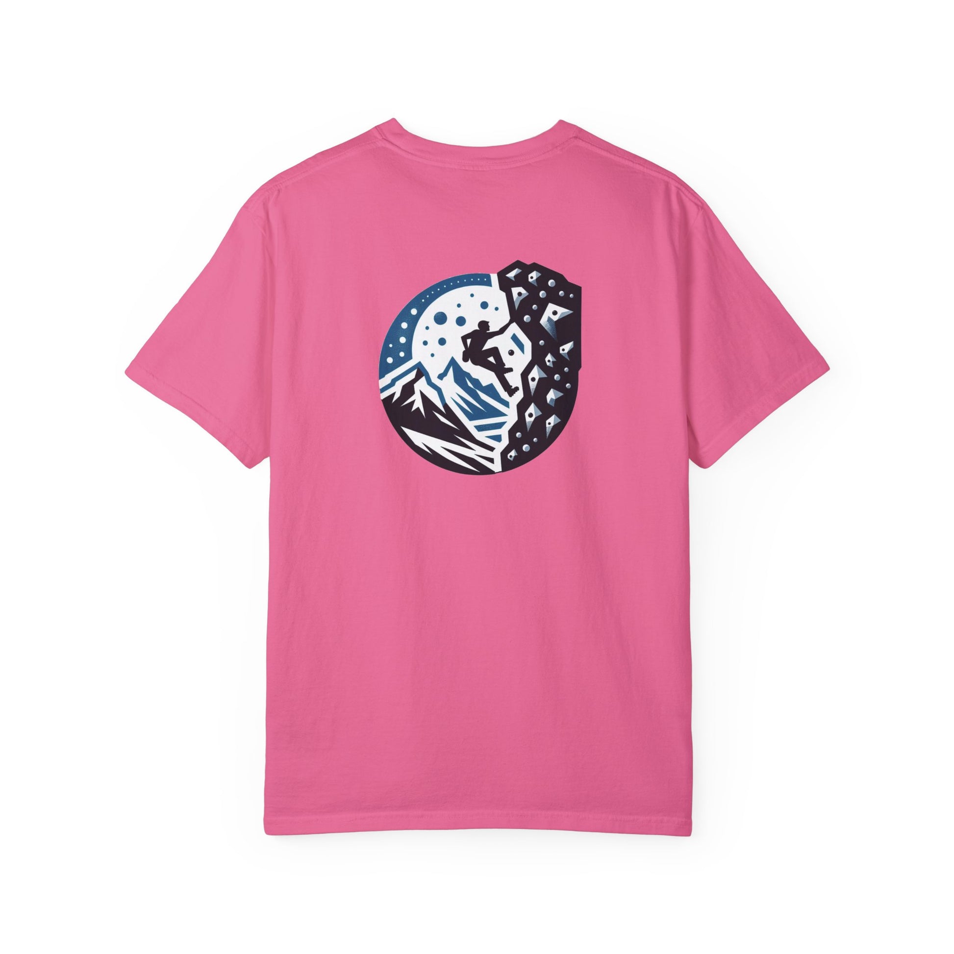 Scale new heights in this soft ringspun tee featuring a graphic print of a rock climber reaching an alpine summit. Part of the Comfort Colors 1717 collection, this medium-weight classic fit tee combines laidback coziness with an action-packed scene.