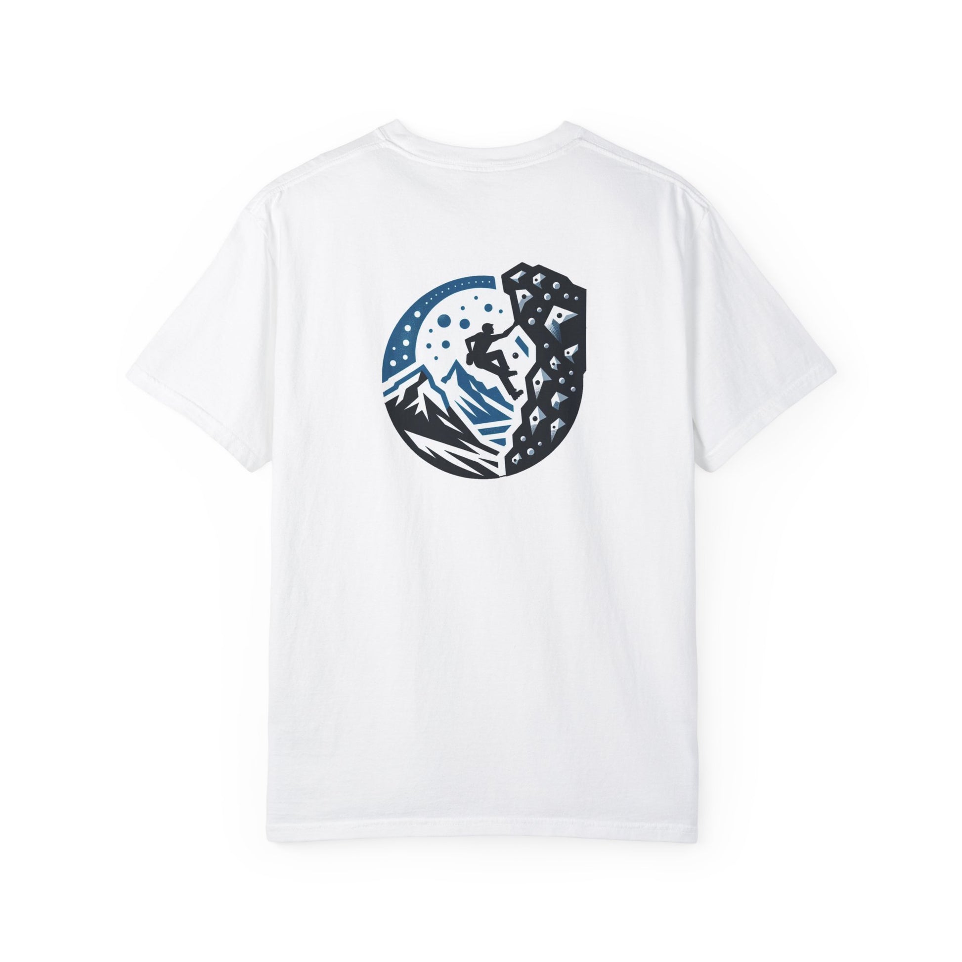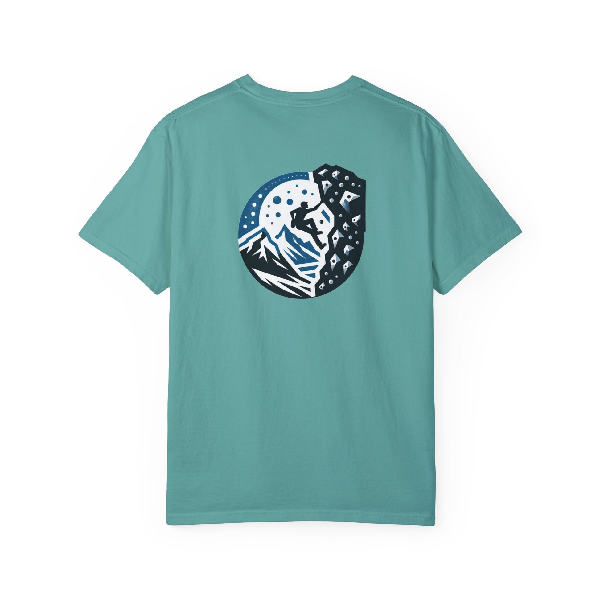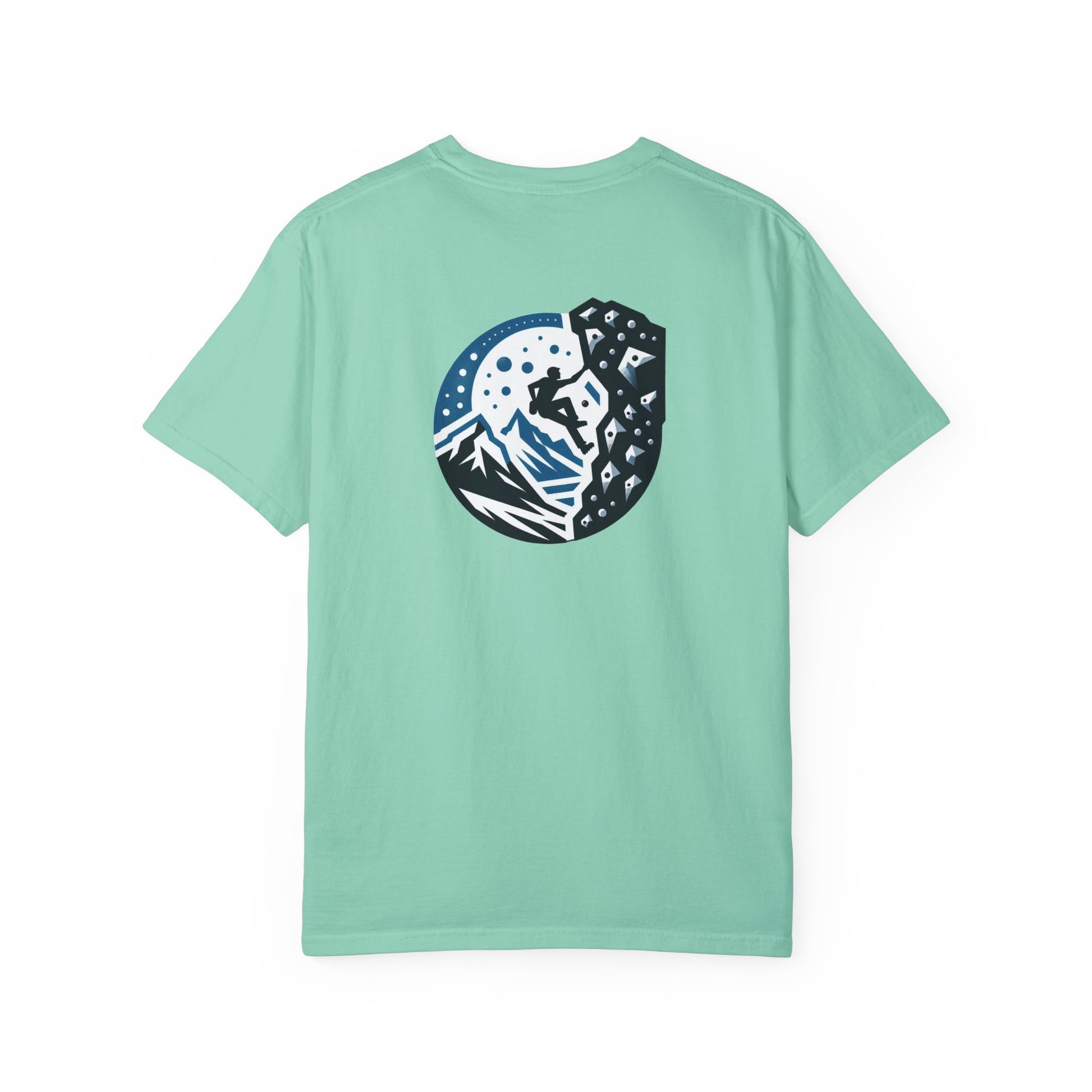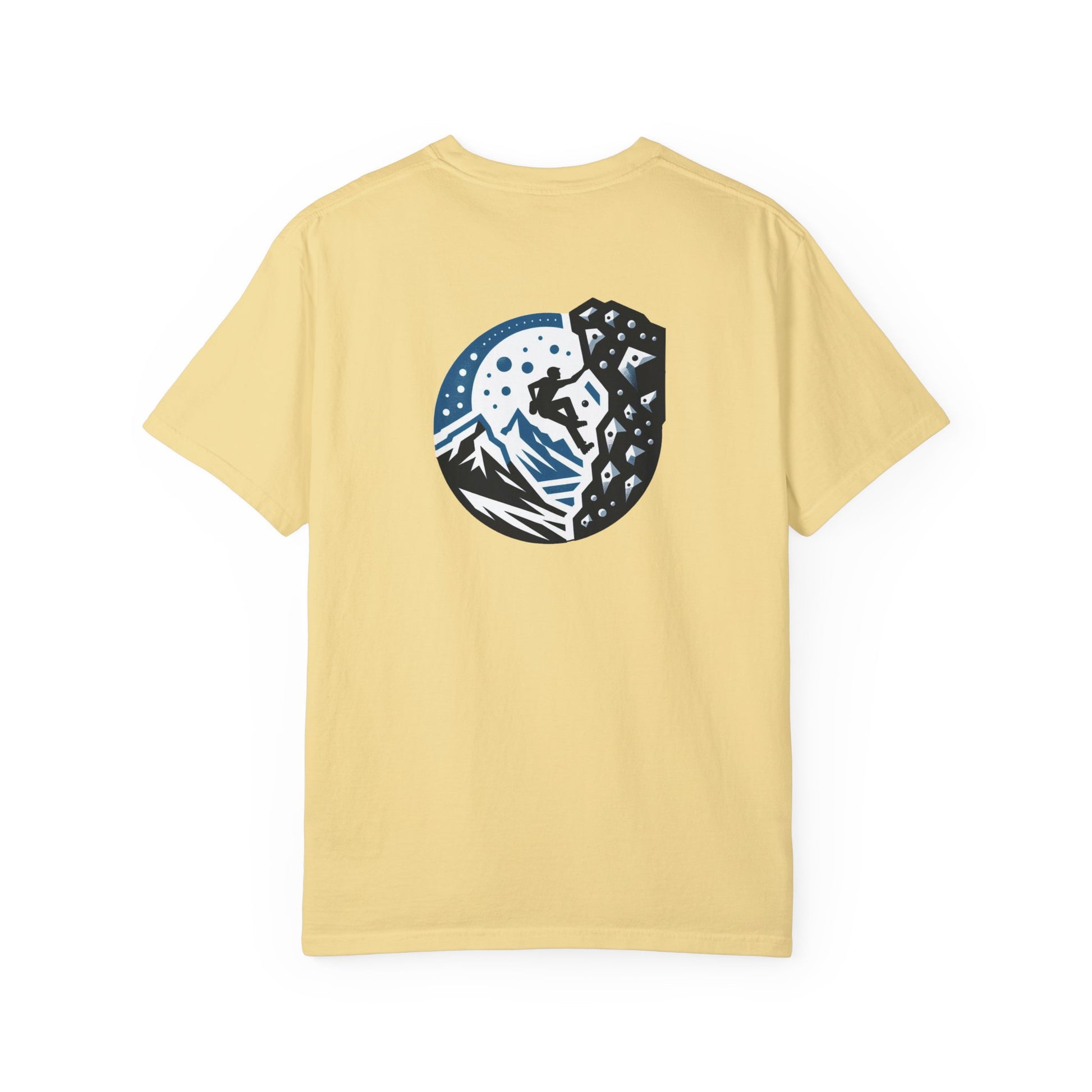 Scale new heights in this soft ringspun tee featuring a graphic print of a rock climber reaching an alpine summit. Part of the Comfort Colors 1717 collection, this medium-weight classic fit tee combines laidback coziness with an action-packed scene.